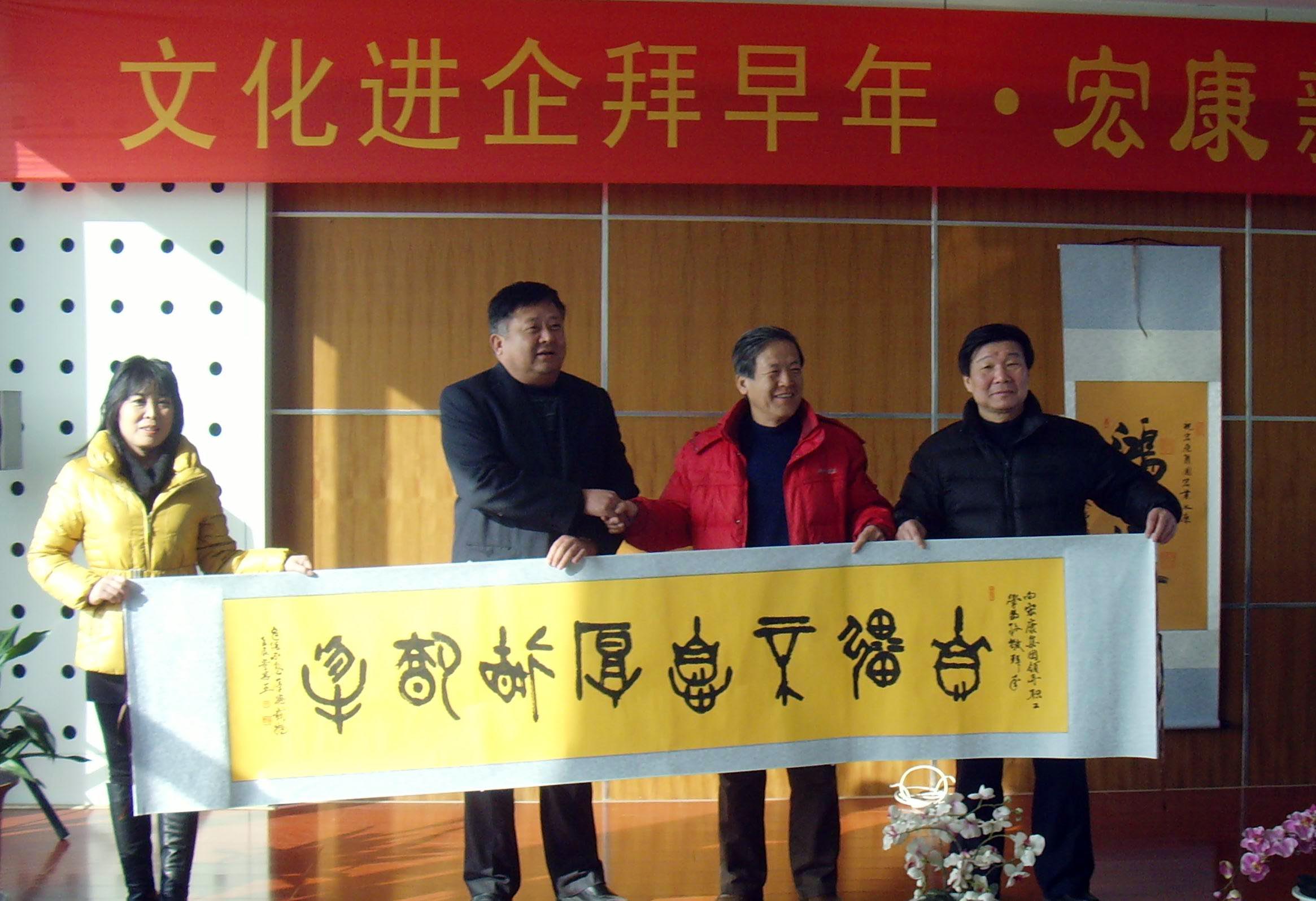 1月24日,泰山文化协会副主席、《泰山文化研究》总编、研究员吕大明,协会秘书长、研究员郭立模,画家、山东科技大学副教授李金玲,山东省甲骨文书法协会理事、泰安市甲骨文书法协会会长、岱宗书画院院长、泰山文化协会特聘专家、北京鲁特书画院院长董德平一行来宏康集团开展“文化进企拜早年·宏康蛇年吉祥”活动。集团董事长、总经理康凤明,副总经理聂化涛及部分员工参加了本次活动。在活动仪式上,书画家们先后作了热情洋溢的讲话。他们对宏康近年来的快速发展给予了高度评价,对宏康积极为国家纳税安排就业,为社会做出巨大贡献,取得良好的社会效益给予了高度赞扬。集团董事长、总经理康凤明作了重要讲话,他说“文化进企拜早年”活动的开展,丰富了企业文化生活,并感谢各位画家书法家们对宏康的厚爱和支持。在活动仪式上,书画家们向宏康集团赠送了他们的作品、书籍,并现场泼墨写字作画、书写春联,一幅幅精美的字画展现在职工面前,令人陶醉,大家对大师们的杰作欣赏之余赞不绝口。蛇年来临之际,宏康员工饱尝了丰富的精神文化大餐,书画家们把温暖送进了宏康员工心中。