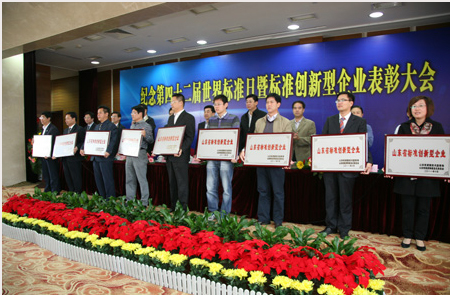 10月14日,山东省质量技术监督局、山东省经济和信息化委员会在济南舜耕山庄联合举行纪念第42届世界标准日暨全省标准创新型企业表彰大会,共同庆祝第42届世界标准日的到来,并对评选出的山东省首届标准创新型企业进行表彰。受董事长、总经理康凤明委托,集团常务副总经理潘宪平参加了此次表彰大会并上台领取“山东省标准创新型企业”荣誉牌匾。