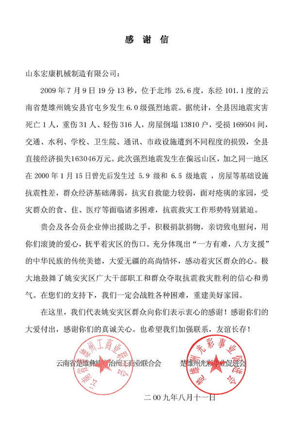 2009年7月9日,云南省楚雄彝族自治州姚安县官屯乡发生6.0级强烈地震,造成重大伤亡和财产损失。作为泰安市工商联副主席会员单位,在危难关头伸出援助之手,向灾区人民进行了捐款援助。以下是转载自该州工商联发来的感谢信。