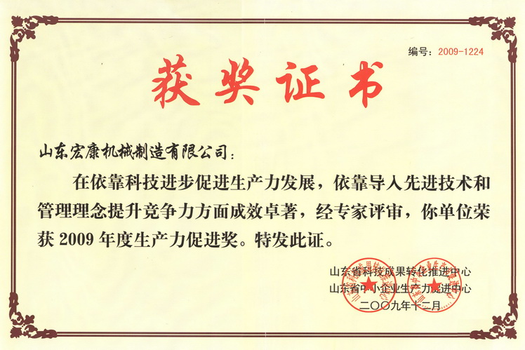 由于我公司在依靠科技进步促进生产力发展,依靠导入先进技术和管理理念提升竞争力方面成效显著,2009年12月,经专家评审,山东省科技成果转化推进中心、山东省中小企业生产力促进中心联合授予我公司“2009年度生产力促进奖”,授予公司“宏康牌数控金属板卷开卷矫平剪切成套设备”“ 山东省民营经济最有价值品牌产品”荣誉称号。