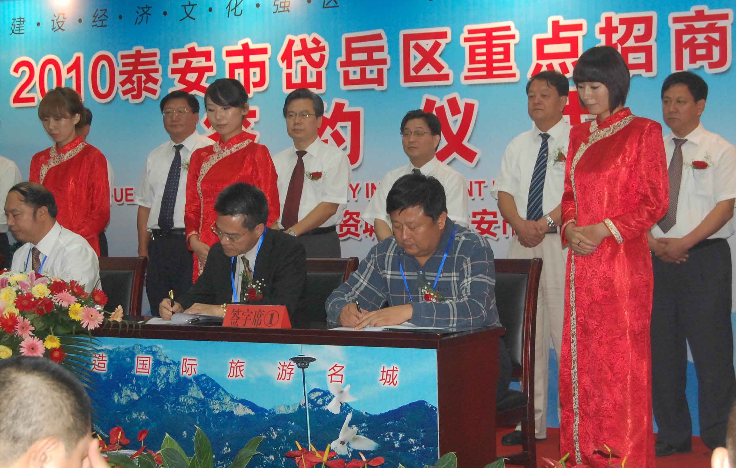 9月7日,2010泰安市岱岳区重点招商项目签约仪式在区政大楼举行,图为公司董事长、总经理康凤明与日本住仓机械株式会社社长纪明岳签署有关合作协议。