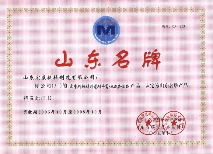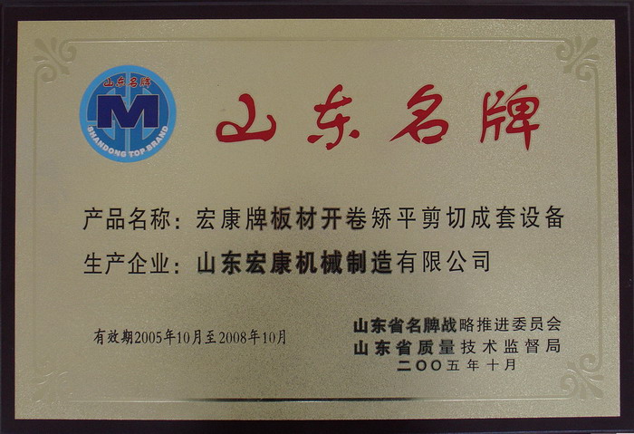 按照《山东名牌产品评价管理办法》规定的程序,在企业自愿申请的基础上,各市审核推荐,各专家组进行材料评审和现场抽查,省名牌战略推进委员会、省质量技术监督局组织用户满意度调查和综合评价,经省政府同意,山东宏康机械制造有限公司生产的宏康牌板材开卷矫平剪切成套设备被评为2005年山东名牌产品,现予以公告。