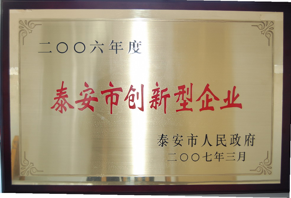 我公司被泰安市政府认定为“泰安市创新型企业”,并在前不久召开的2007年全市经济工作大会上为我公司颁发了奖牌和十万元奖金。在全市10多家获奖企业中,我公司是岱岳区2006年度唯一获此殊荣的企业。
