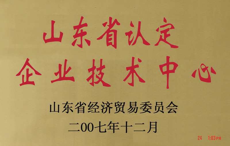 2007年11月13日,山东省经贸委下发鲁经贸技字[2007]390号文件,公布了山东省第十四批企业技术中心的通知,我公司技术中心被认定为山东省第十四批企业技术中心。这是我公司技术中心继2005年被认定为市级技术中心后的又一殊荣,也是省政府对我公司技术创新体系建设成就的充分肯定。今后,我公司将进一步加大技术中心建设、管理和投入力度,争创国家级企业技术中心、为提升公司核心竞争力,促进公司又好又快发展奠定坚实的基础。