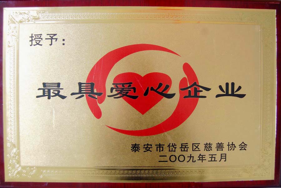 5月22日,在岱岳区召开的“全区慈善工作暨慈善月动员会议”上,公司被授予“最具爱心企业”称号,副董事长朱洪芹被岱岳区慈善协会授予“慈善之星”称号。